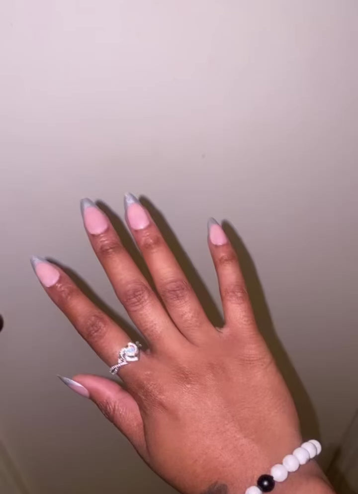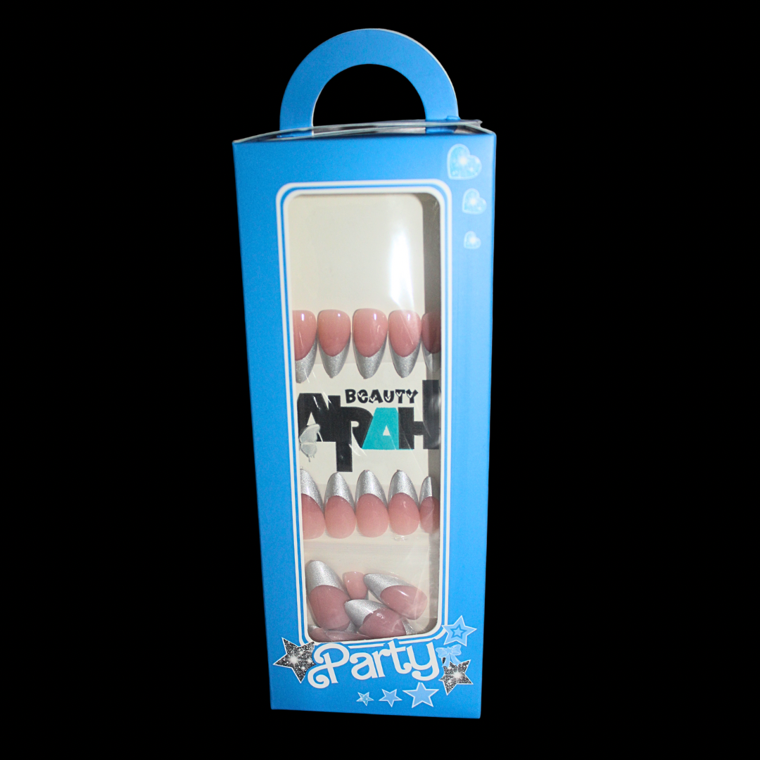 Edgy meets chic. The Chrome Harts set features a silver chrome design paired with soft nude tones, giving you a bold yet classy look that’s impossible to ignore. Perfect for nights out, special events, or when you want your nails to steal the spotlight.